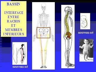 L’hypothèse de départ : le bassin constitue la « clé de voûte » de l’ensemble du système au cours de la croissance. Il jouerait un rôle important, au cours de l’apprentissage de la marche, à la fois dans la mise en place des courbures vertébrales (hypothèse 1) et dans la formation des axes mécaniques des membres inférieurs (hypothèse 2).